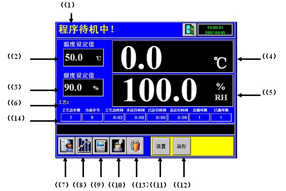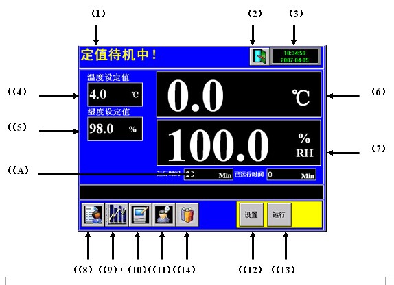 12、高温杀菌:在潮湿的环境中容易生成各种霉菌,因此特设高温杀菌功能。在定值控制窗口中点击“设置”,把温度设定为100℃,运行时间设定为60分钟,点击运行时间“ON”起动定时器。在定值控制窗口中点击“运行”开启高温杀菌。杀菌结束后点击运行时间“OFF”关闭定时器。