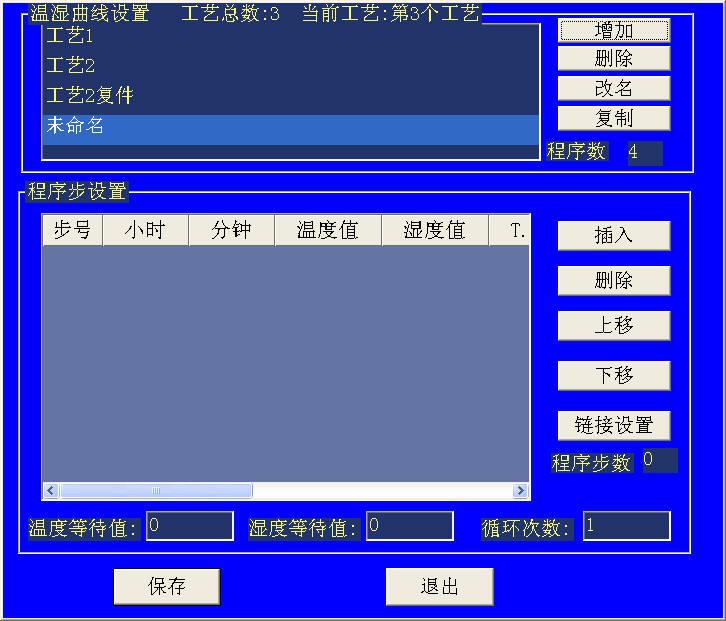 在程序控制窗口中按“设置”键进入程序工艺设置窗口,在此窗口中用户可设置并保存1000组工艺曲线,其中每组工艺最大步数可达1000步.工艺名可设置为中文。输入中文工艺名时请勿超过5个汉字。