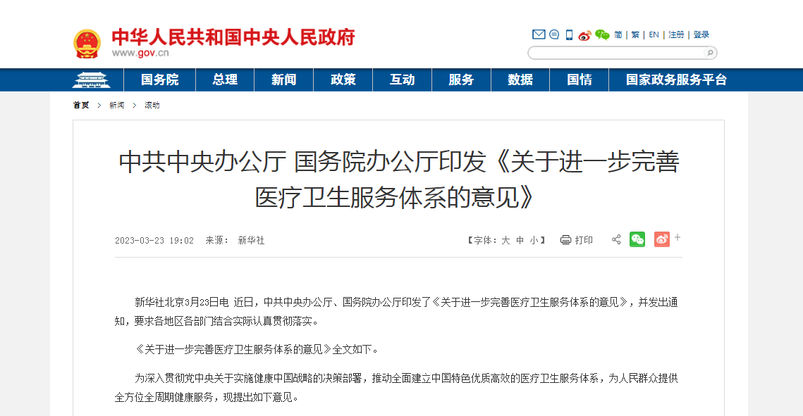 近日,中共中央办公厅、国务院办公厅印发了《关于进一步完善医疗卫生服务体系的意见》(以下简称《意见》),并发出通知,要求各地区各部门结合实际认真贯彻落实。