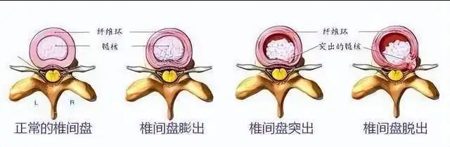 随着年龄增长,髓核所含有的水分逐渐减少,质地变脆。外围纤维环也同样质地变硬,弹性变差,在这种情况下如果受到外力过大两个上下椎体一挤压,就可能会出现膨出、突出或脱出。